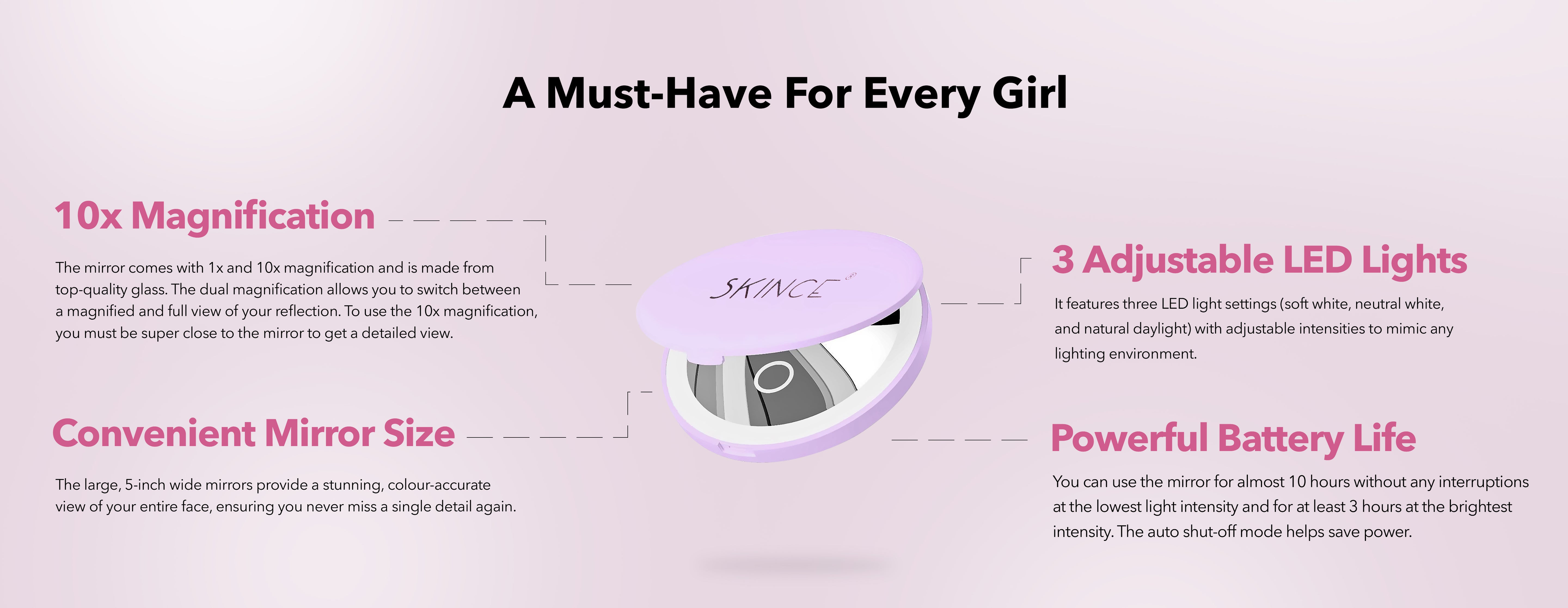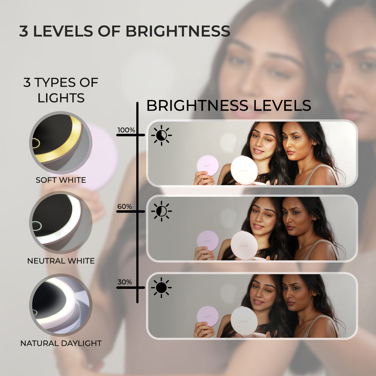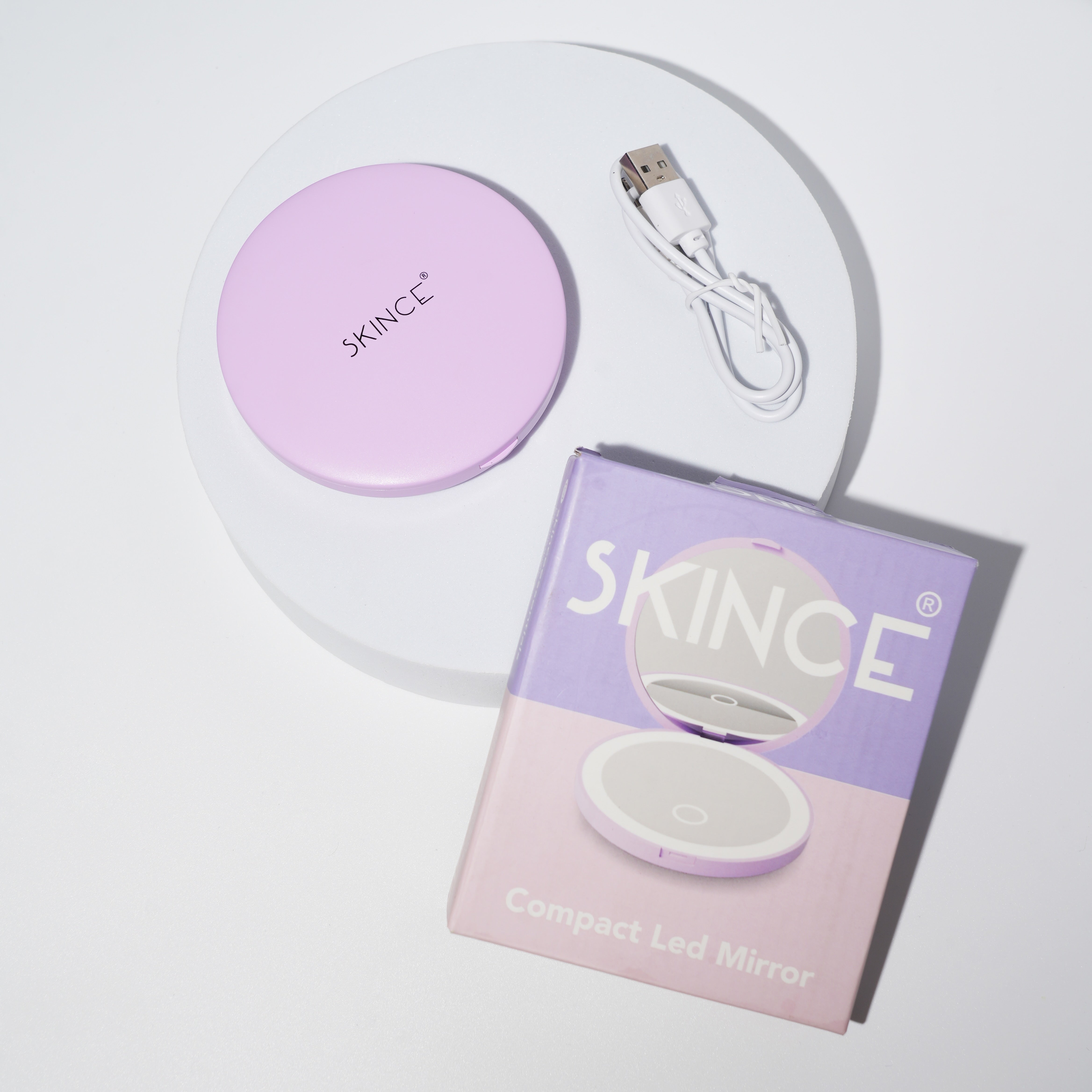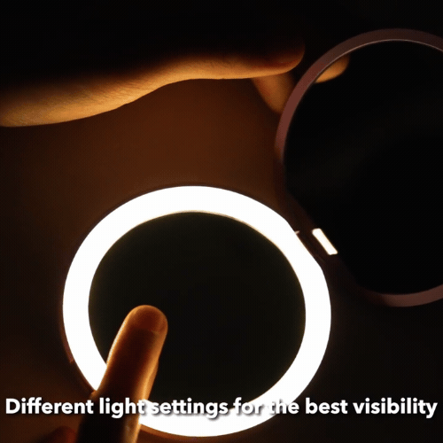 Introducing the Skince Compact LED Mirror, the perfect beauty companion for every woman. Imagine yourself on your way to a date, in a dimly lit car, or on a crowded city street, taking one last look! Our Compact LED Mirror daylight-like ring light offers the perfect lighting for those on-the-go touch-ups 👄. With 3 different light color and intensity settings, you can keep your makeup and hair looking great anytime, anywhere. 💃🏻