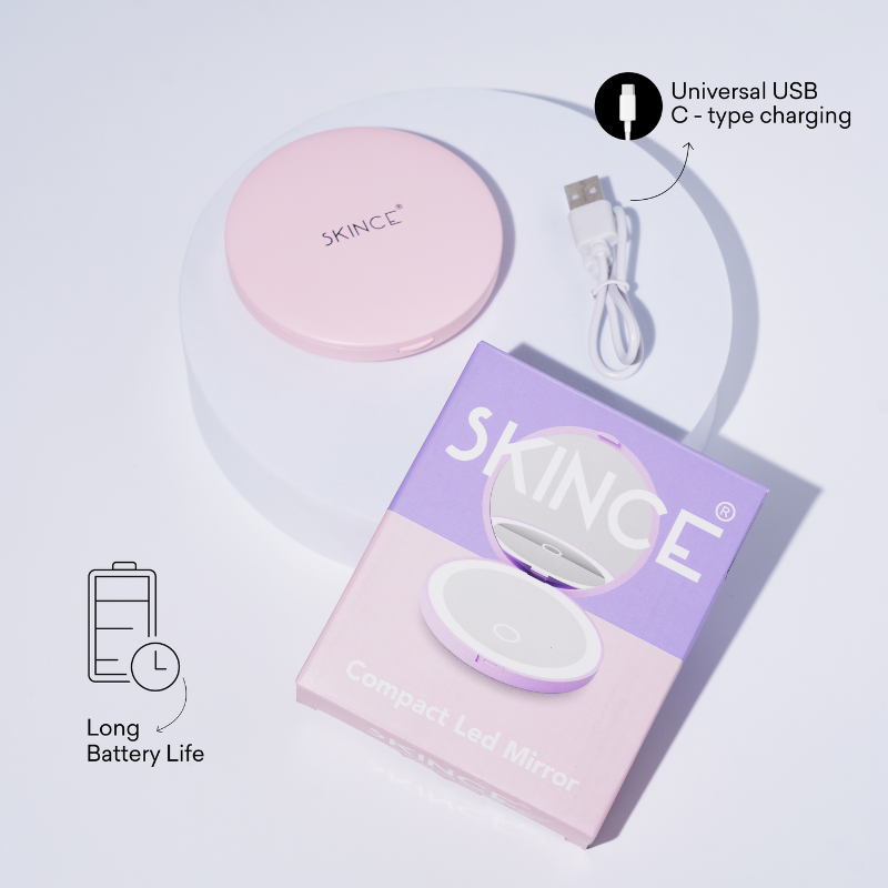 Introducing the Skince Compact LED Mirror, the perfect beauty companion for every woman. Imagine yourself on your way to a date, in a dimly lit car, or on a crowded city street, taking one last look! Our Compact LED Mirror daylight-like ring light offers the perfect lighting for those on-the-go touch-ups 👄. With 3 different light color and intensity settings, you can keep your makeup and hair looking great anytime, anywhere. 💃🏻